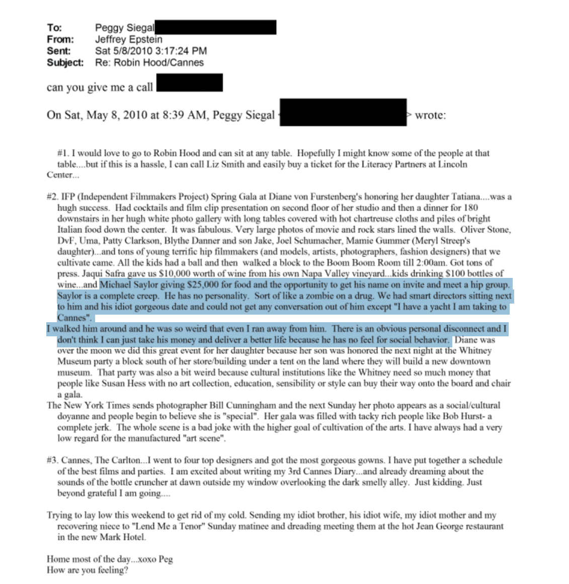 В рассекреченных документах несколько раз упоминается соучредитель Strategy (ранее MicroStrategy) Майкл Сейлор. В письме 2010 года речь шла о его пожертвовании в $25 тыс. на благотворительное мероприятие, связанное с окружением Эпштейна: за это он получил доступ к закрытым мероприятиям и возможность эксклюзивных знакомств с представителями высшего общества.