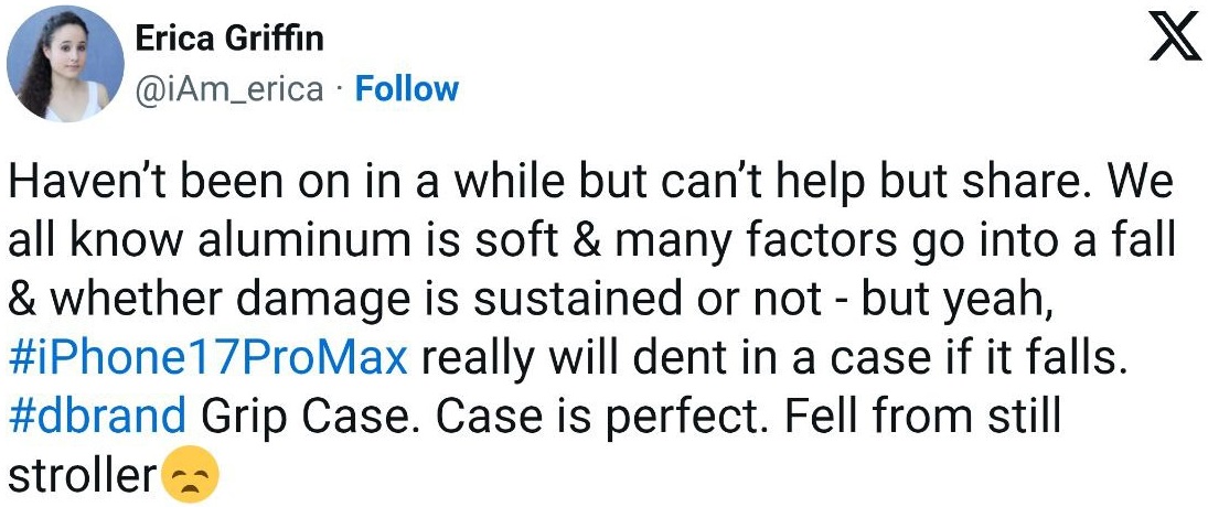 «Не могу не поделиться. Мы все знаем, что алюминий мягкий, и на падение и то, будет ли повреждение, влияет много факторов — но да, iPhone17 Pro Max действительно может помяться в чехле, если упадет. Grip Case. Чехол идеальный. Упал с неподвижной тележки», — рассказала Эрика в заметке.