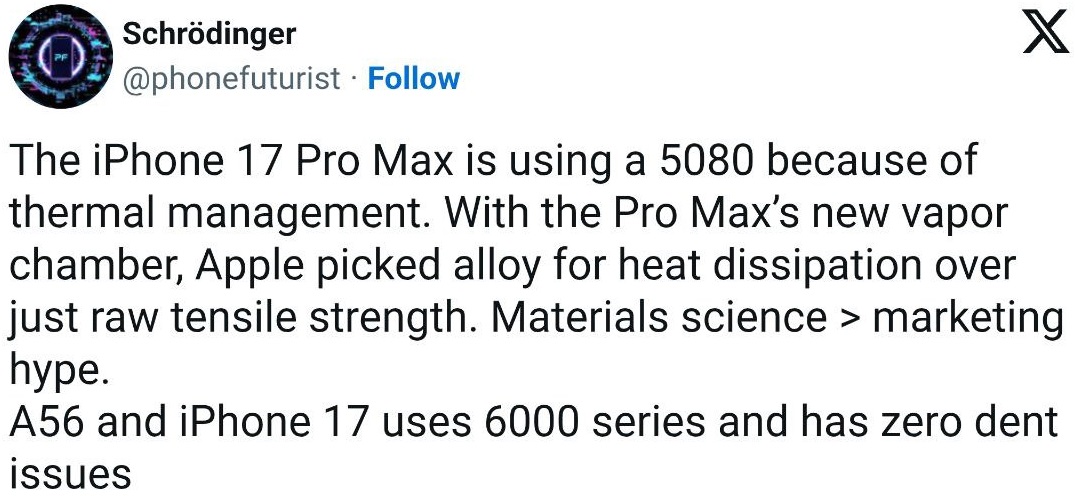 «iPhone 17 Pro Max использует сплав серии 5080 из-за теплоотвода. С новой испарительной камерой в Pro Max Apple выбрала сплав с лучшим рассеиванием тепла вместо простой максимальной прочности на растяжение. Материаловедение и маркетинговый хайп. A56 и iPhone 17 используют серию 6000 и не имеют никаких проблем с вмятинами», — написал Schrödinger.