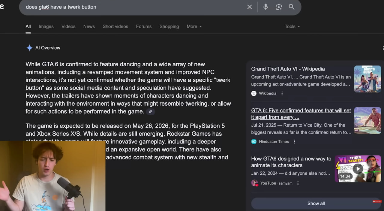 Ютубер Джеффри Филлипс рассказал, что месяцами манипулировал фактами ради любопытства. Мужчина хотел заставить искусственный интеллект Google поверить в вымышленную «кнопку тверка» в GTA 6 — и ему удалось обмануть систему. В настоящее время в сети не так много утечек и деталей о будущей АААААА-игре, поэтому поисковик «схватился» хоть за что-то.