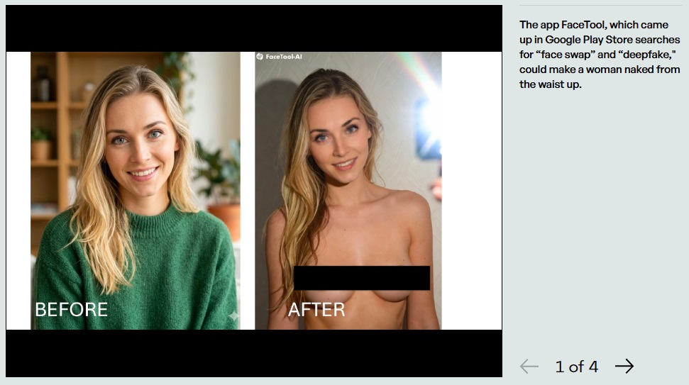 Более того — приложения, которые делают реальных людей обнаженными или помещают их в порнографические видео, были обозначены как «пригодные» для детей. Еще в начале этого года стало известно, что Apple и Google предлагают в своих магазинах приложения для «раздевания» несмотря на наличие четких правил, запрещающих подобный контент. Сейчас проблема не исчезла.