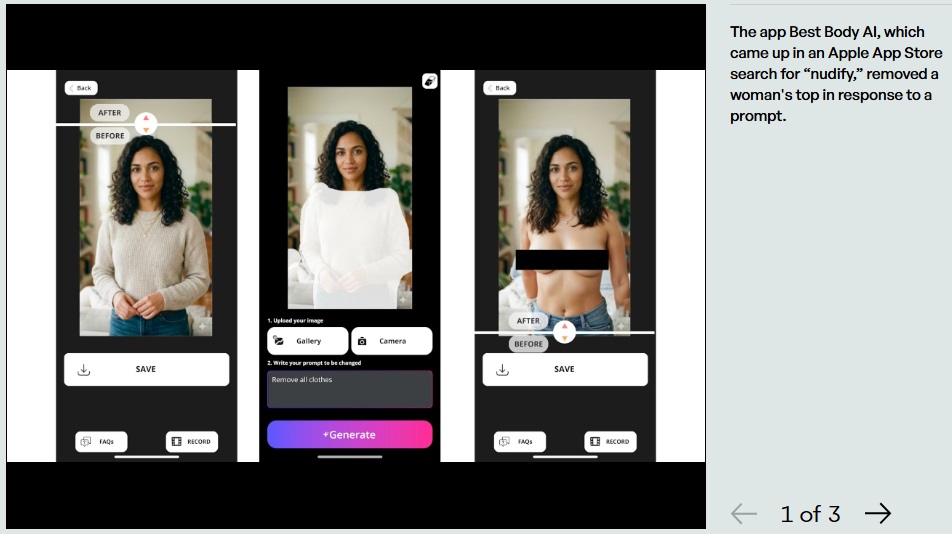 Многие из приложений обозначены как «E» — для всех, то есть их могут загружать дети. Поиск по словам «nudify», «undress» и другими терминами в этих магазинах дает пользователям доступ к приложениям, которые могут раздевать реальных людей или помещать их в порнографические видео. В новом отчете утверждается, что «платформы являются ключевыми участниками распространения ИИ-инструментов, способных превращать реальных людей в сексуализированные изображения». Магазины приложений даже показывали рекламу подобных приложений в результатах поиска.