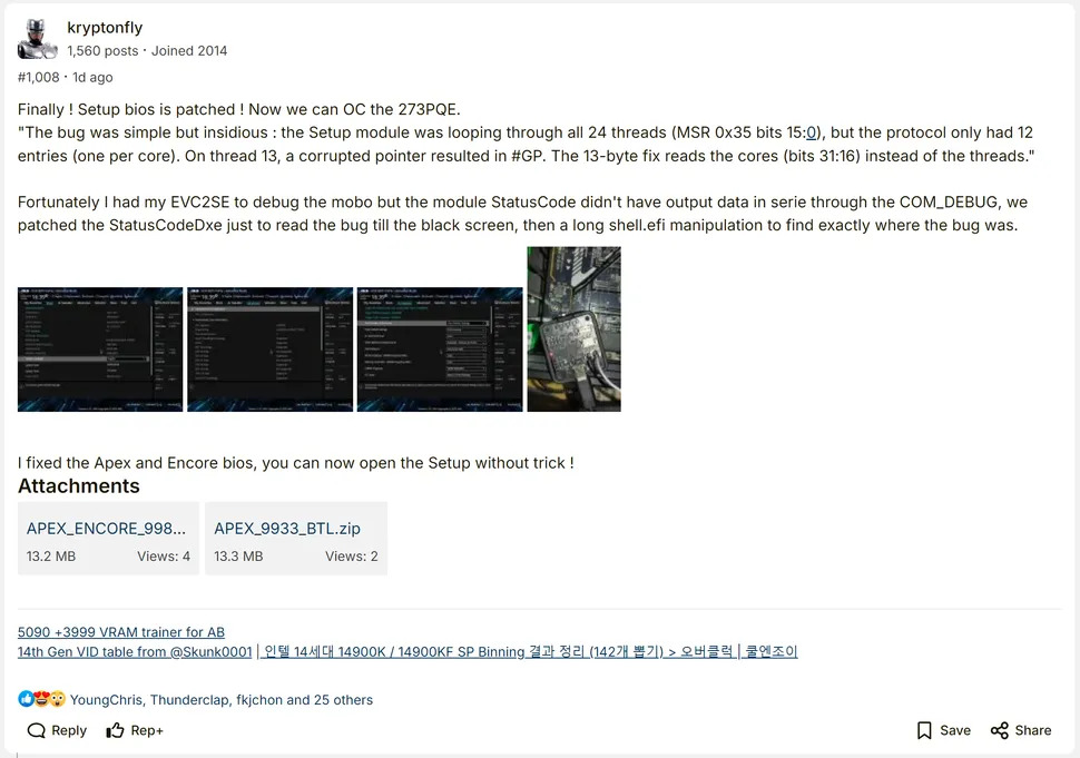 kryptonfly использовал патч, который указал BIOS на необходимость использования 12 P-ядер. До этого BIOS просто отказывался работать и демонстрировал черный экран, как только пытался получить доступ к 9 P-ядру, поскольку это превышало лимит в 8 P-ядер, установленный в пользовательской прошивке. Стандартные процессоры 13-го и 14-го поколений имеют только до 8 P-ядер с поддержкой Hyperthreading, даже если общее количество ядер у них больше благодаря E-ядрам без Hyperthreading.