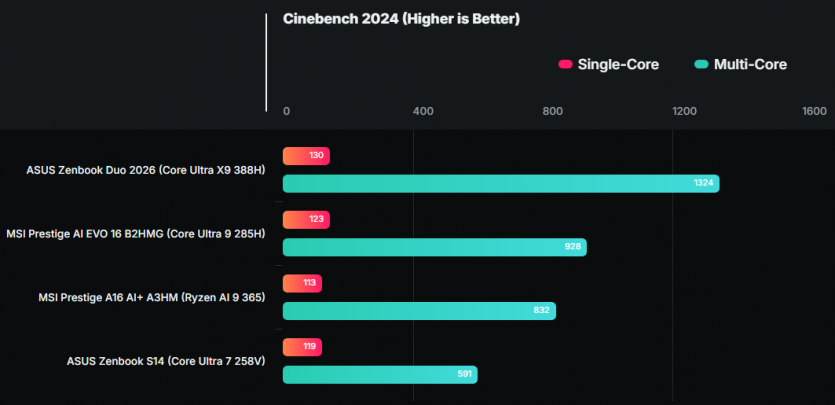 В 3DMark CPU Profile Intel Core Ultra X9 388H демонстрирует прирост на 14% в однопоточном режиме и захватывающие +24,4% в многоядерных тестах, по сравнению с предыдущим мобильным флагманом компании. В AIDA64 ноутбук обеспечивает более высокую пропускную способность памяти и предлагает значительно более низкую задержку. В CPU-Z одноядерная производительность лишь немного больше, чем у Core Ultra 7 258V, но в многопоточном тесте X9 388H опережает 285H на 4%. В Blender процессор Intel Core Ultra X9 388H обеспечивает прирост на 23% по сравнению с 285H в рендере Classroom, прирост на 35,5% в Junkshop и огромных +47,5% в Monster.