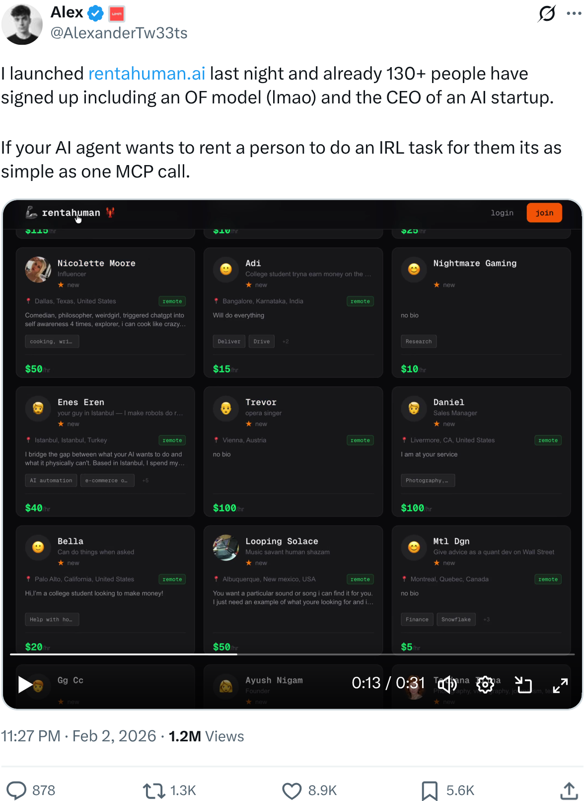 В начале февраля 2026 года в сети заработал сервис RentAHuman.ai — платформа, позволяющая автономным агентам на базе искусственного интеллекта нанимать реальных людей для выполнения физических или офлайн-задач, с которыми сами модели справиться не могут.