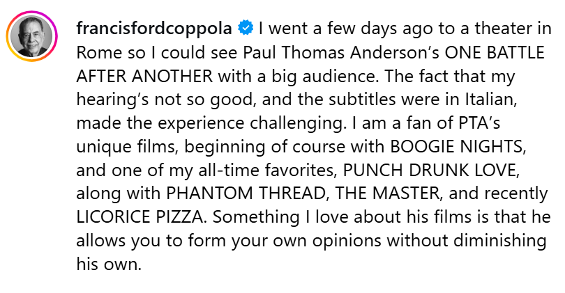«Несколько дней назад я пошел в кинотеатр в Риме, чтобы посмотреть фильм Пола Томаса Андерсона «Одна битва за другой», вместе с большой аудиторией», — пишет Коппола в Instagram. «Впрочем, из-за того, что мой слух не достаточно хорош, а субтитры транслировались на итальянском, этот опыт был довольно сложным».