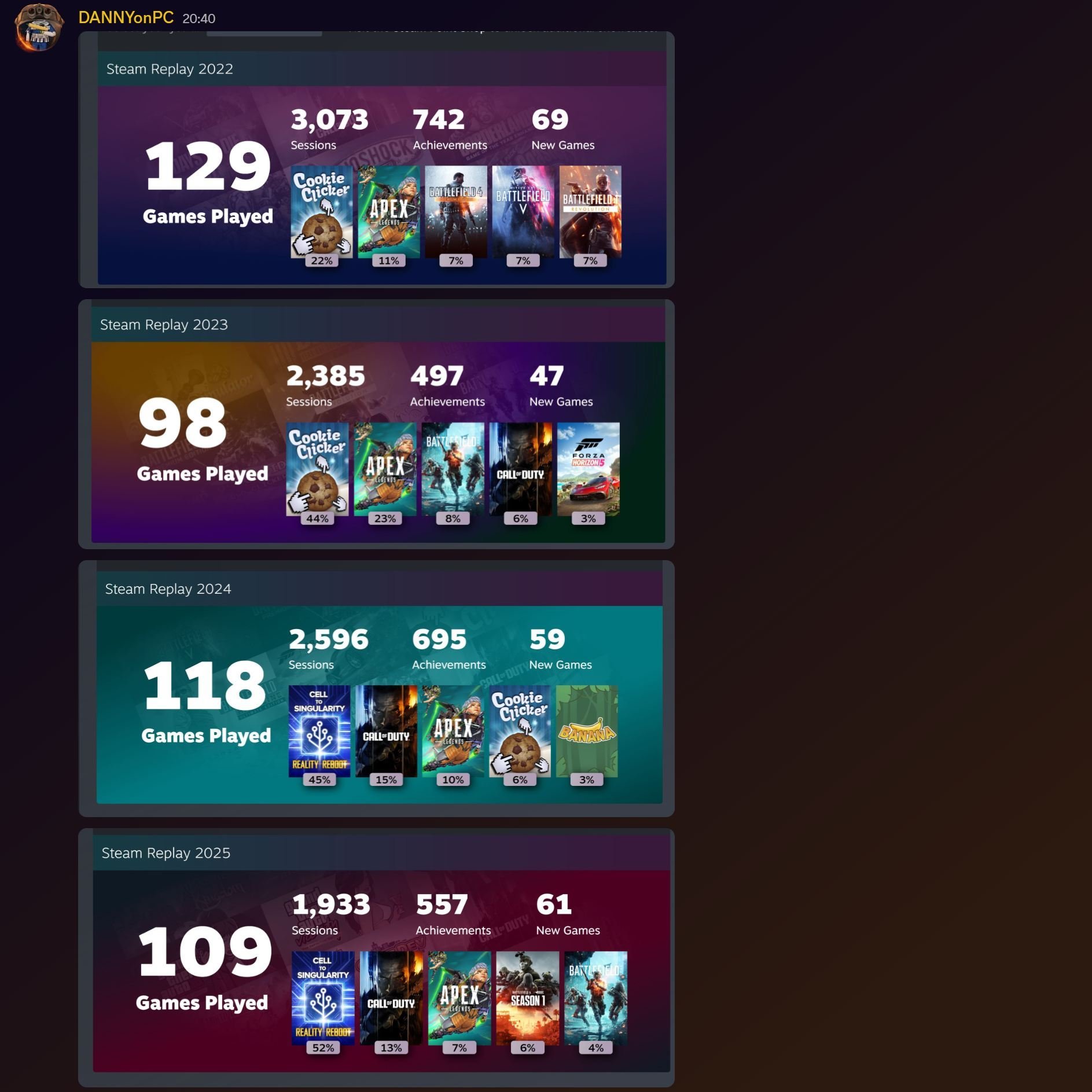Платформа присоединяется к другим сервисам со своими итогами, охватив период с 1 января по 14 декабря 2025 года. Valve показывает ваши самые популярные игры, количество полученных достижений, часы геймплея, в том числе в новых или более старых релизах. А также подсвечивает активность геймера с процентным соотношением по отдельным проектам.