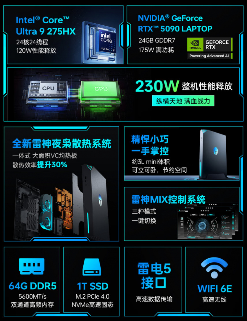 Thunderobot выводит на рынок MIX G2 — игровой мини-ПК объемом 3,2 литра, который также сочетает Core Ultra HX и GPU RTX 50 Laptop. Старшая конфигурация имеет процессор Core Ultra 9 275HX, видеокарту RTX 5090 Laptop, 64 ГБ оперативной памяти и 1 ТБ SSD. Энергопотребление системы составляет до 230 Вт (120 Вт CPU + 175 Вт GPU).