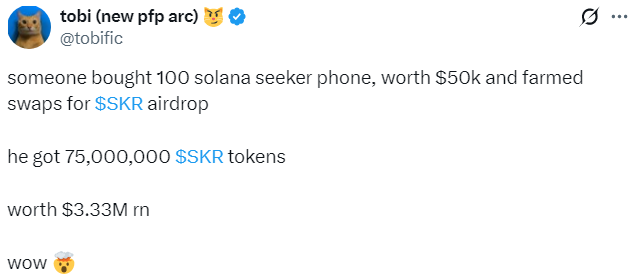 Solana Mobile запустила аирдроп токенов SKR для владельцев «криптофонов» Solana Seeker. На фоне этого криптоэнтузиаст приобрел 100 смартфонов за $50 тыс. и через фарминг свопов получил 75 млн токенов SKR, которые сейчас оцениваются в $3,33 млн.