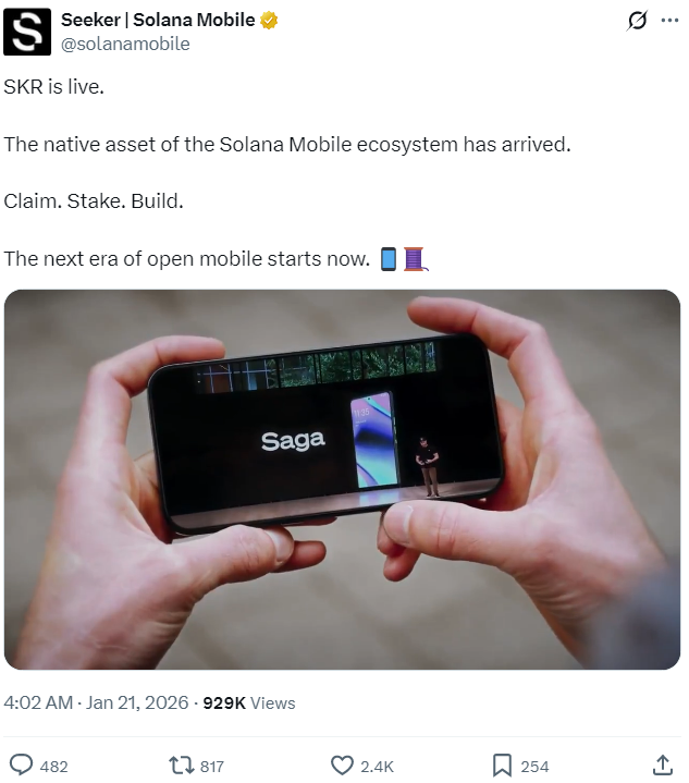 «SKR активирован. Заклеймить. Стейкать. Строить. Следующая эра открытой мобильности начинается сейчас», — да указано в объявлении Solana Mobile в Х.