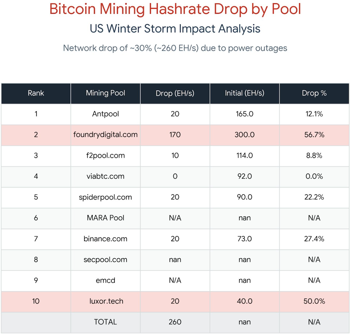 «Из-за экстремальных зимних штормов в США несколько майнинговых ферм по всей стране столкнулись с отключениями электроэнергии. Совокупный хешрейт биткоина за короткий период снизился примерно на 30%, что соответствует падению на 260 EH/s», — говорит Лю.