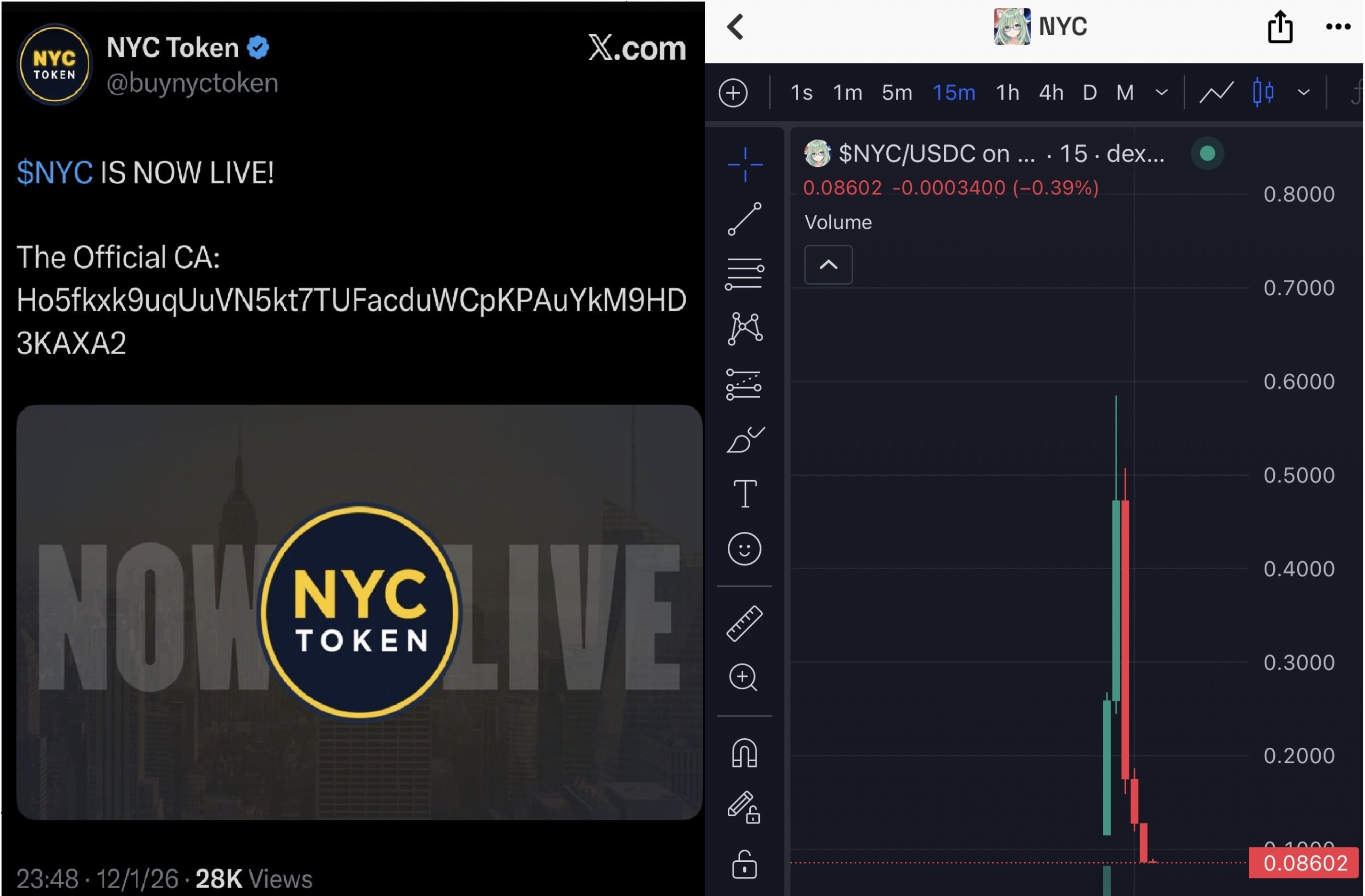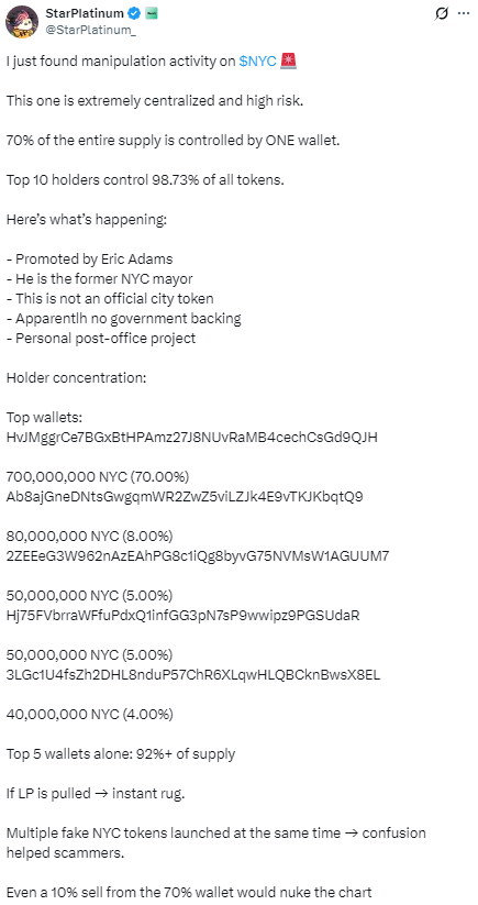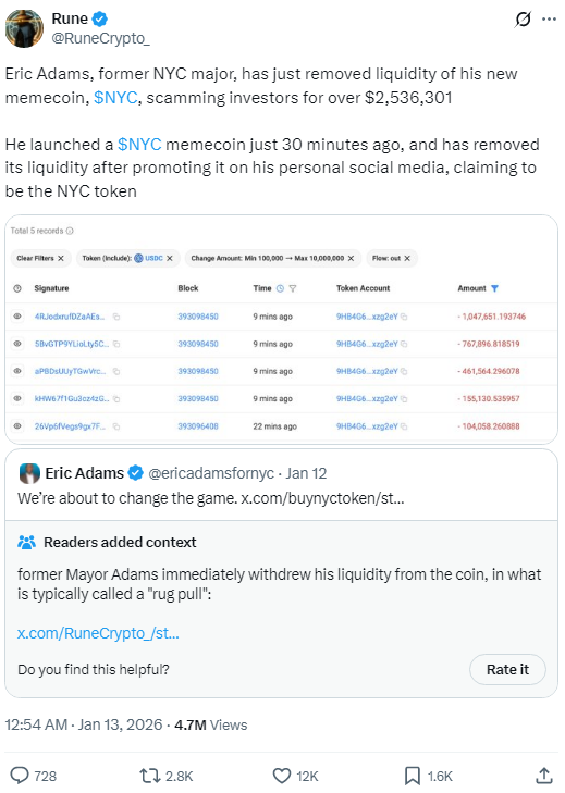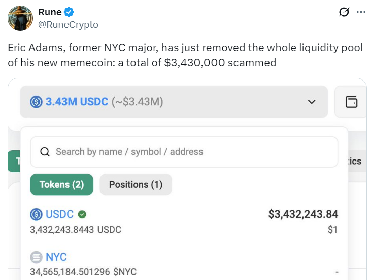 Эрик Адамс, бывший мэр Нью-Йорка, в начале недели анонсировал запуск мемкоина NYC Token. Уже через несколько часов после запуска появились признаки rug pull — ликвидность токена была выведена, а цена NYC Token упала сначала примерно на 80%, а затем — более чем на 90%.