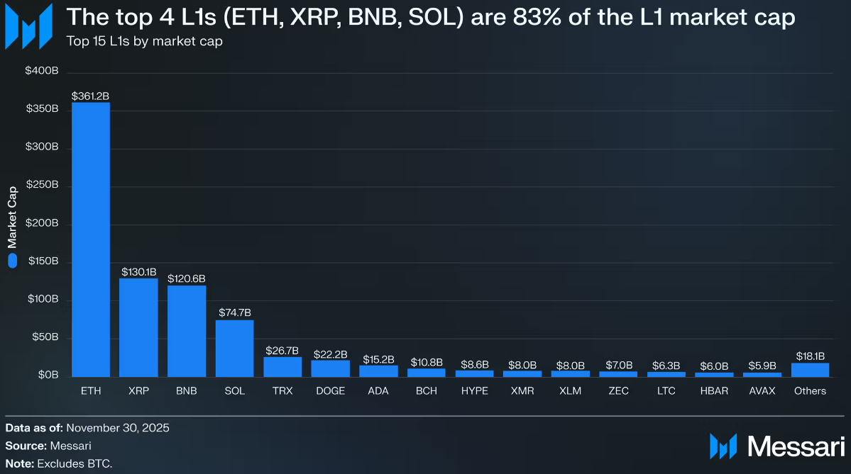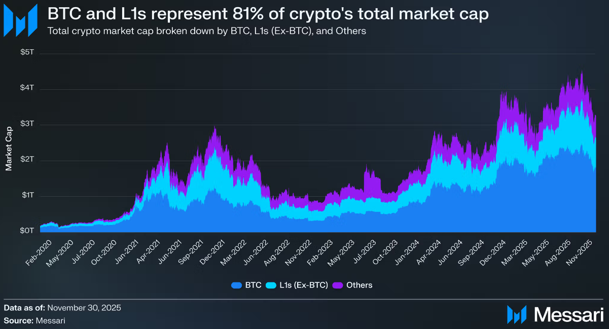 По прогнозу Messari, биткоин удерживает статус единственного «денежного» актива крипты. Рынок регулярно возвращается к BTC в периоды неопределенности и паники. Большинство Layer 1 альткоинов будут оставаться слабее Bitcoin, ведь быстрые и дешевые транзакции не гарантируют доверия как к деньгам. Ethereum остается институционально понятным и популярным среди инвесторов, но часто служит «усиленной версией BTC» по динамике и движениям капитала.
