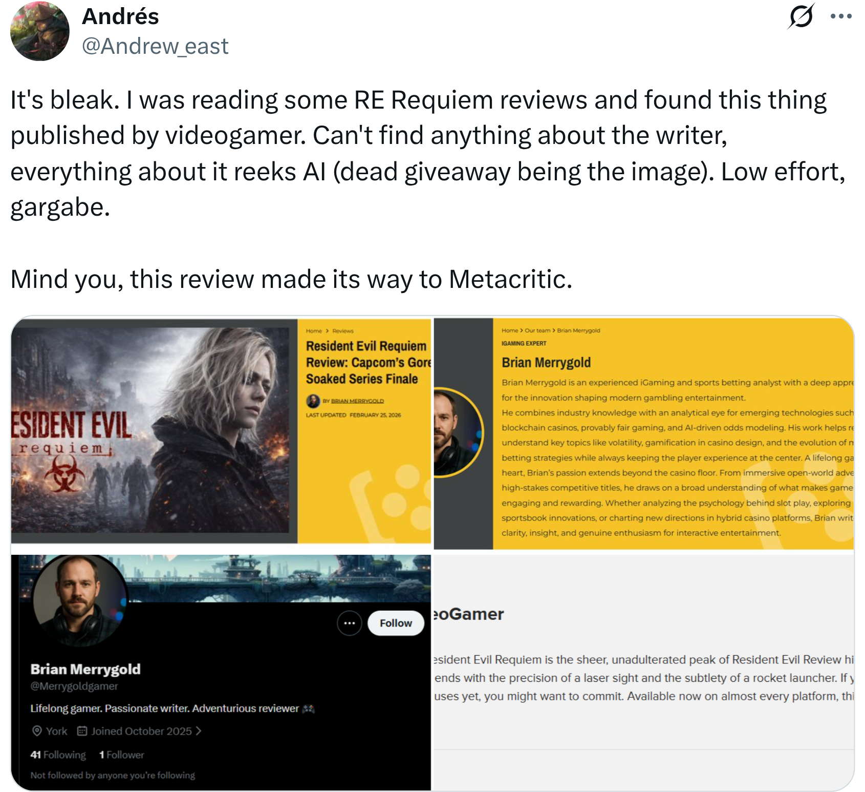 Как отметил по крайней мере один пользователь в X, стоит относиться с подозрением и к Мерриголду. Профиль автора на VideoGamer столь же неуклюже написанный. При попытке сохранить изображение локально, его название файла — «ChatGPT-Image-Oct-20-2025-11_57_34-AM-300×300» — тоже выдает его происхождение, как и сам обзор, а фотография профиля, кажется, создана ИИ. Издание Kotaku проверили аккаунты в X нескольких других авторов недавних материалов на VideoGamer и обнаружили подобные признаки. Все их аватарки выглядят как созданные ИИ, а аккаунты были созданы примерно в одно и то же время в октябре 2025 года.