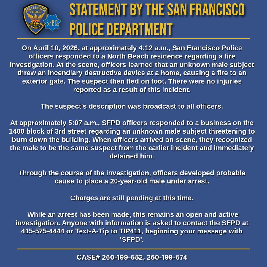 После того, как мужчина убежал пешком, полиция нашла и арестовала его примерно через час, реагируя на жалобу предприятия в отношении «неизвестного мужчины, который угрожал поджечь здание». Этим предприятием оказалась штаб-квартира OpenAI, а подозреваемый оказался тем самым мужчиной, который бросил коктейль Молотова в дом Альтмана.
