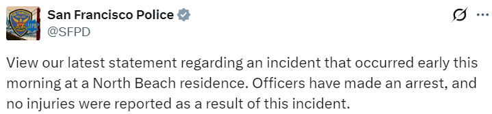 В заявлении, опубликованном в X, полиция Сан-Франциско написала, что около 7:12 по восточному времени отреагировала на вызов для расследования пожара в районе Норт-Бич в Сан-Франциско.