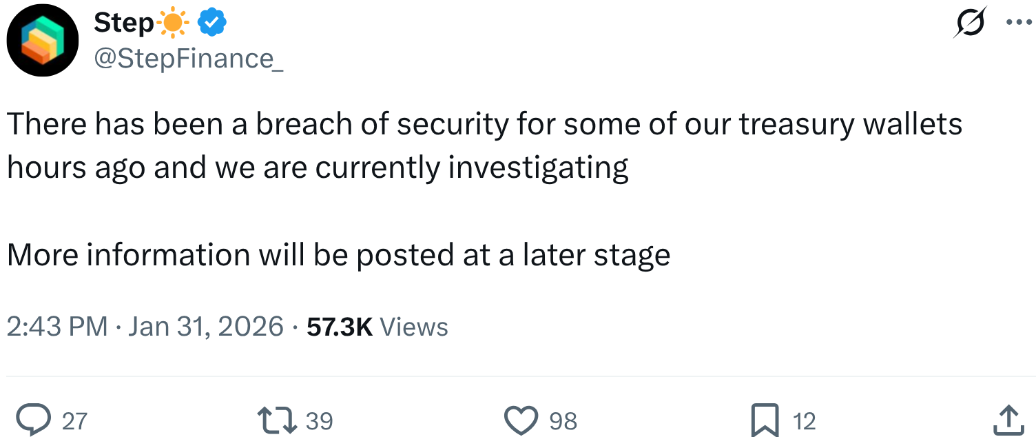 «Несколько часов назад некоторые из наших казначейских кошельков были скомпрометированы. Мы сейчас расследуем этот вопрос. Больше информации будет обнародовано в ближайшее время», — сообщали STEP Finance в записи от 31 января.