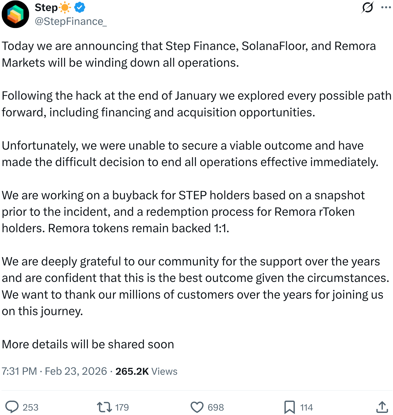 «Сегодня мы объявляем, что Step Finance, SolanaFloor и Remora Markets прекращают все операции. После взлома в конце января мы исследовали все возможные пути дальнейшего развития, включая финансирование и возможности приобретения. К сожалению, нам не удалось обеспечить жизнеспособный вариант, и мы приняли решение немедленно завершить работу», — написала команда STEP 23 февраля.