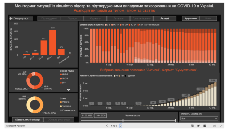 Как и последние запущенные правительством онлайн-инструменты для мониторинга ситуации, новая панель мониторинга основана на ПО Microsoft Power BI. Она состоит из нескольких основных экранов со статистическими данными о коронавирусной инфекции COVID-19 в Украине. Данные берутся из реестров Центра общественного здоровья Украины. Как отмечалось выше, статистика постоянно обновляется, так что с помощью этой панели можно узнать оперативную информации о количестве официально подтвержденных случаев заболевания, госпитализированных, пребывающих на самоизоляции, выздоровевших и умерших пациентах в разрезе областей и по всей Украине. Более того, есть подробная статистика по отдельным больницам, а также по гендерной и возрастной группах. Все данные систематизированы и поданы в удобоваримой форме с графиками и диаграммами.