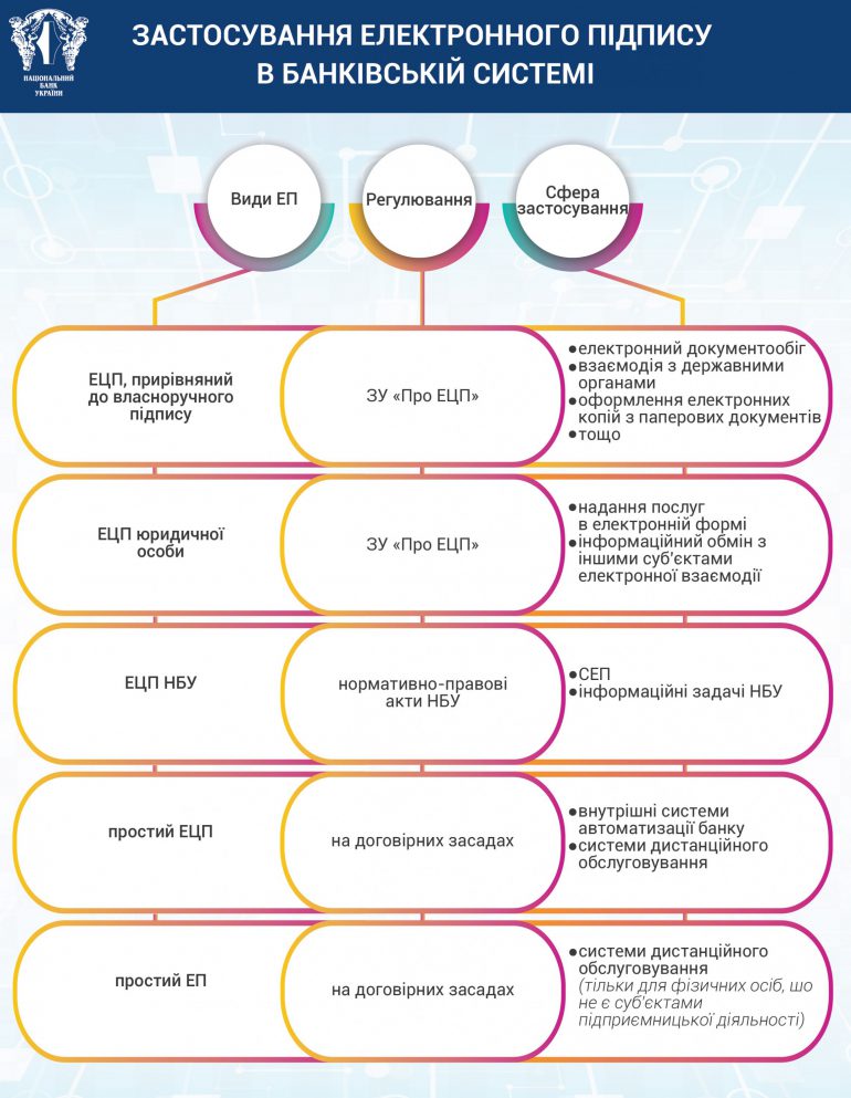 - определяются виды электронной подписи, применяемые в банковской системе Украины;