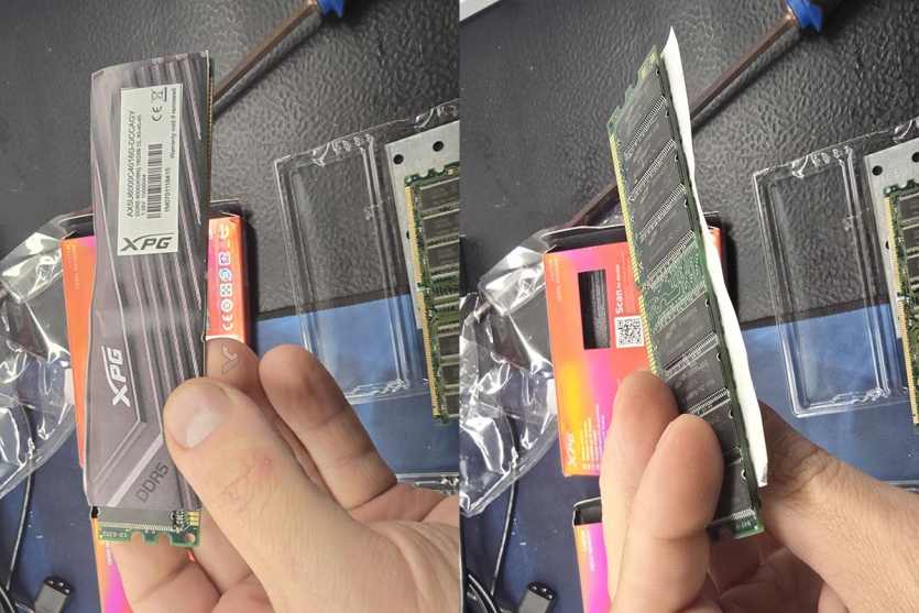 Проблема обнаружилась при вскрытии третьего комплекта во время сборки ПК. Коробка была запаяна в пленку и внешне выглядела вполне аутентично. Внутри же лежали два старых модуля DDR или DDR2, на которые наклеили стикеры, имитирующие маркировку радиаторов DDR5, а также металлическая пластина — вероятно, для создания «правильного» веса упаковки.