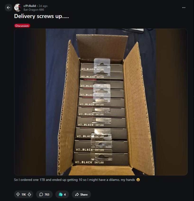 u/Bat-Dragon-666 отмечает, что заказывал один SSD-накопитель WD_Black SN7100. Это высокопроизводительные SSD 4 поколения, которые стоят почти $200 на Amazon US. Цена всего комплекта составляет около $2 тыс. Пользователь также раскрывает продавца, что указывает на ошибку ритейлера. Пока неизвестно, не заставят ли пользователя вернуть ошибочно отправленный товар.