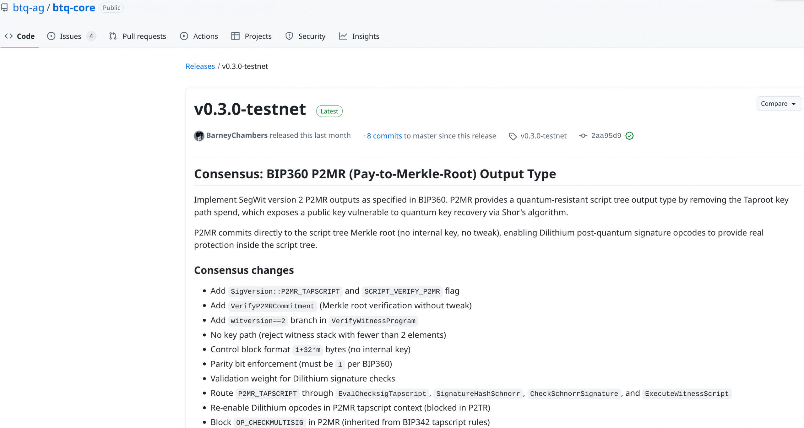 В тестнете уже активированы все пять опкодов постквантовых подписей Dilithium (стандарт NIST ML-DSA) в контексте P2MR tapscript. Разработчики могут создавать кошельки, пополнять их и проводить полноценные P2MR-транзакции через CLI прямо сейчас.