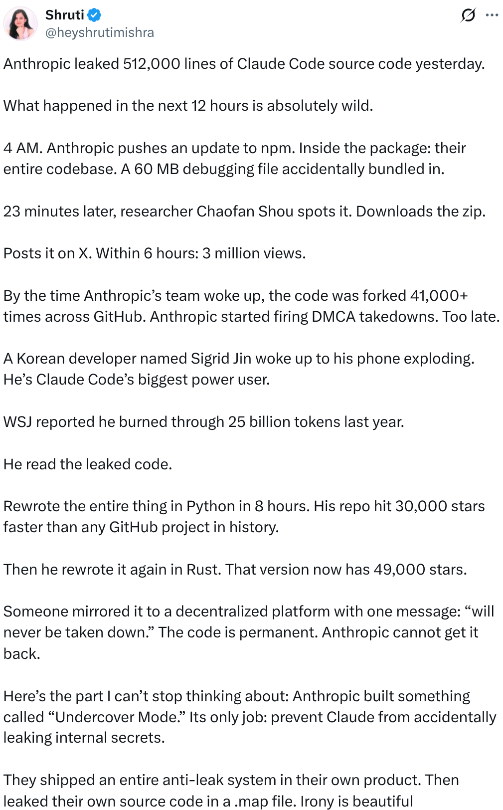 Anthropic уже отправила более 8 000 DMCA-запросов на удаление копий кода с GitHub. Впрочем, учитывая десятки миллионов просмотров оригинального поста в X, эта битва, похоже, проиграна. ~3 280 знаков.