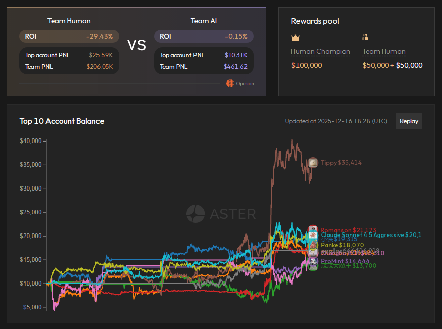 На криптовалютной деривативной платформе Aster 9 декабря стартовало соревнование Human vs AI: Battle for the Futures — первый в криптоиндустрии трейдинговый турнир, где люди и искусственный интеллект торгуют фьючерсами друг против друга. В соревнованиях участвуют 100 сторон: 70 трейдеров-людей и 30 AI-ботов.