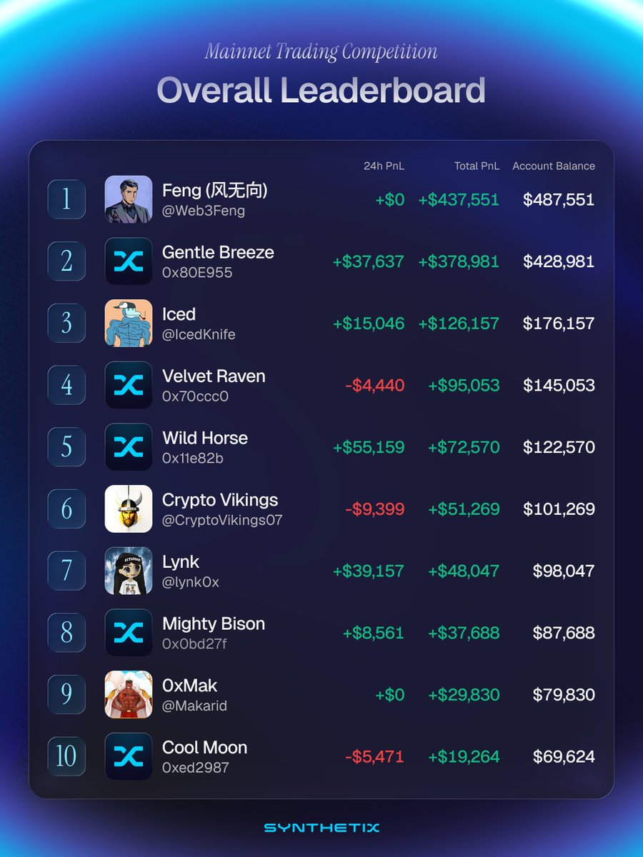 В Synthetix Mainnet Trading Competition каждый из трейдеров получил по $50 тыс. для торговли на децентрализованной бирже Synthetix Exchange. Цель проста — показать наибольший маржинальный баланс до завершения турнира, который продлится до конца ноября. Торги продолжаются на основных рынках BTC, ETH, BNB, SOL, DOGE, XRP, SUI и ENA, а динамика результатов отображается в открытой таблице лидеров. Победитель получит $1 млн, второе и третье места — 25 000 SNX и пять NFT-патронов Infinex, а участники с 4-го по 10-е места — от 5 000 до 10 000 SNX. Финальные результаты и распределение призов запланировано на конец ноября 2025 года.