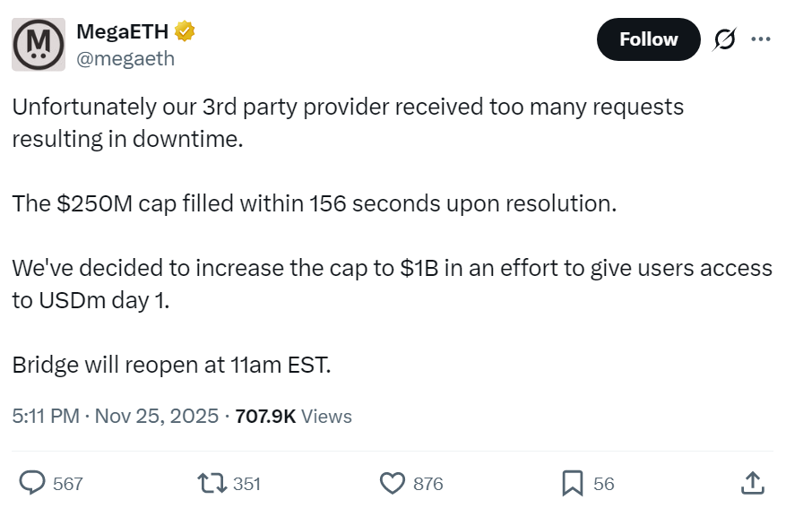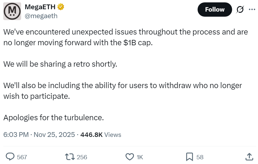 Неожиданное открытие привело к новому резкому наплыву ликвидности. Команда в реальном времени наблюдала, как баланс растет без возможности вмешаться. Намерение ограничить сбор на уровне $400 млн не сработало — транзакция поступила слишком поздно. Контроль удалось вернуть лишь на отметке $500 млн. После этого MegaETH отказался от намерения повышать лимит до $1 млрд.