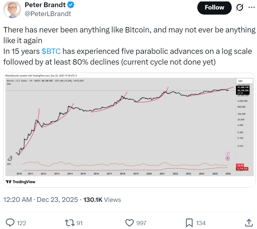 В то же время мнения относительно биткоина разделились. Джефф Ко прогнозирует, что по базовому сценарию BTC может достичь $180 тыс. к концу 2026 года, учитывая умеренные положительные факторы для ликвидности. При этом опытный трейдер Питер Брандт напоминает об исторических циклах: за 15 лет биткоин пережил пять параболических взлетов с последующими падениями минимум на 80%. В текущем квартале BTC уже упал более чем на 22%, что делает его вторым худшим четвертым кварталом в истории.