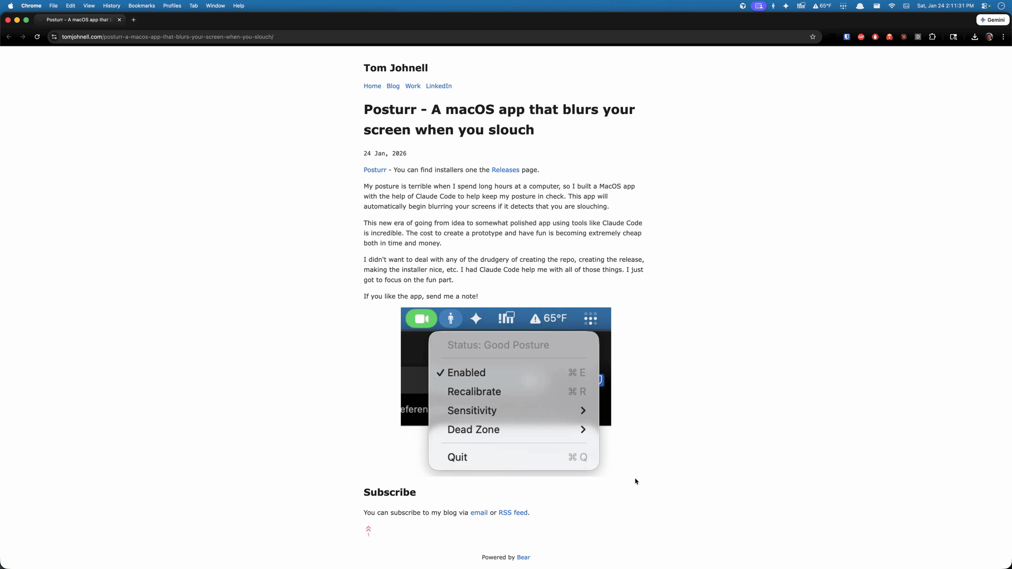 Том Джонелл представил приложение, которое использует камеру ноутбука, чтобы в реальном времени следить за осанкой пользователя. Если человек начинает сутулиться, экран постепенно размывается. Когда спина выравнивается — изображение сразу становится четким.