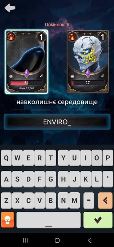 Когда все слова уровня уже использованы, а враг не умер, игра запускает «второй круг» с теми терминами, где вы ошиблись. Если что игрок может использовать магическую энергию для подсказок. После победы появляется новый случайный противник. Пока что это скелеты, но механики будут расширяться, поскольку игра нуждается в доработках. В будущем добавят «глобальную карту очистки», которая будет показывать восстановление мира, а также новые скиллы вроде лечения или критических ударов.
