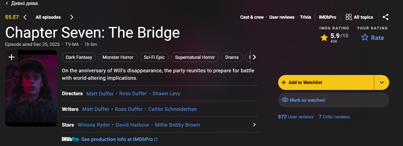 Создатели сериала братья Дафферы обещали, что не повторят ошибок «Игры престолов» в финале, а шансы на жалобы будут составлять 0, 5%. Однако, последние оценки показывают, что их планы серьезно нарушились. На момент написания новости на Rotten Tomatoes «Очень странные дела» имеют 58% от зрителей для пятого сезона, в то время как седьмой эпизод под названием «Мост» на IMDb упал до катастрофических 5,9 балла — самая низкая оценка среди всех эпизодов шоу.