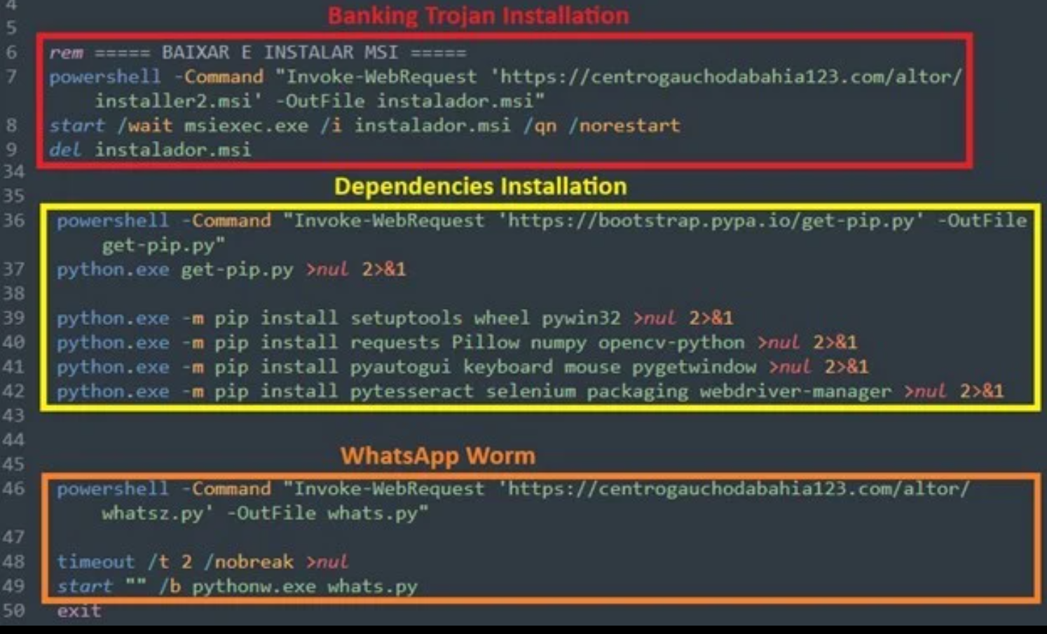 Червь похищает контакты, фильтруя группы и бизнес-аккаунты, и отправляет данные (номер, имя, или сохраненный контакт) через HTTP POST на C2-сервер. Если язык ОС — бразильский португальский, троян сканирует окна и процессы на наличие финансовых сервисов и криптовалютных платформ и только тогда активируется.