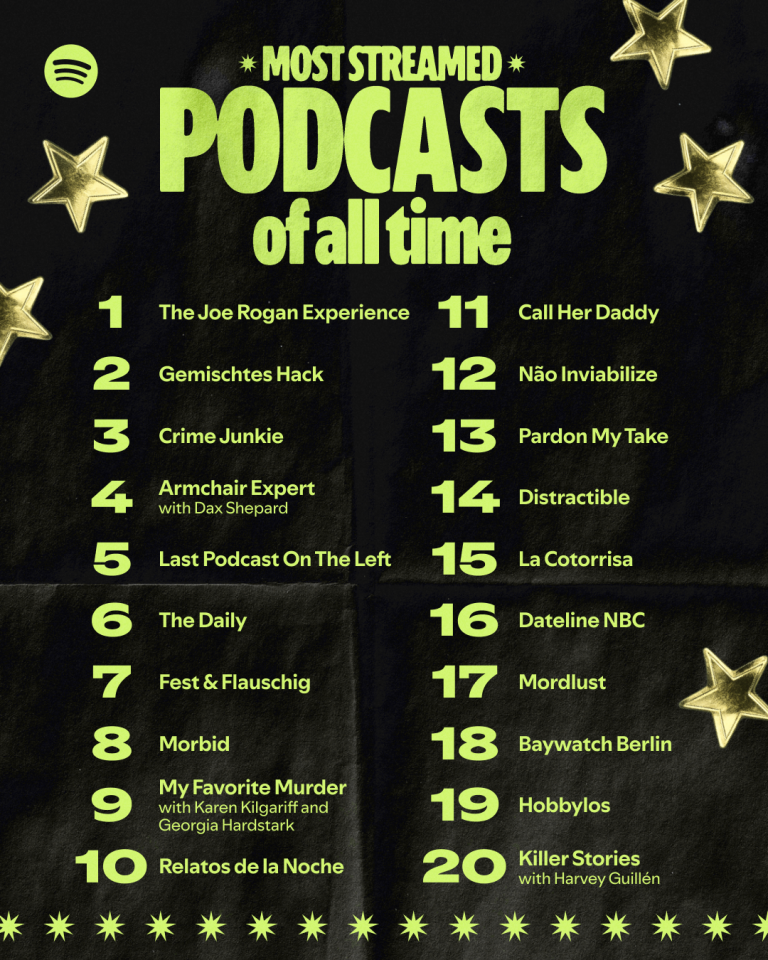 Среди подкастов безоговорочный лидер — The Joe Rogan Experience. На втором и седьмом местах — немецкоязычные шоу Gemischtes Hack и Fest & Flauschig, что свидетельствует о весе немецкоязычной аудитории Spotify. Список аудиокниг возглавила A Court of Thorns and Roses Сары Дж. Маас — первая часть серии, три книги которой вошли в топ-20.