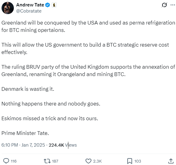 Скандальный инфлюенсер Эндрю Тейт заявил, что США используют Гренландию как ключевую инфраструктурную базу для майнинга биткоина, превратив остров в природный «холодильник» для криптовалютных дата-центров. Это позволит добывать BTC с минимальными затратами.