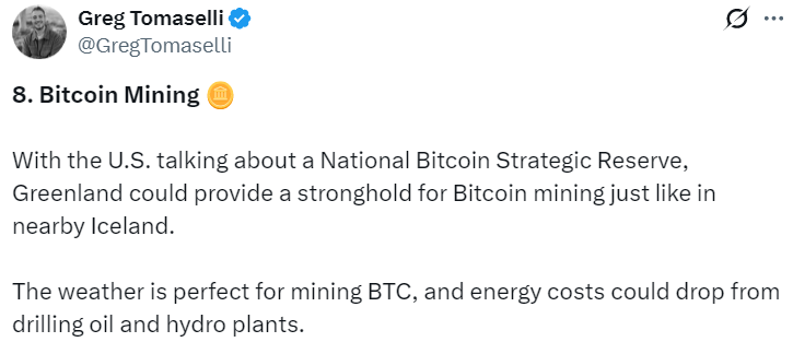 «Гренландия будет использована США как постоянный «холодильник» для операций по добыче BTC. Это позволит правительству экономически эффективно сформировать стратегический запас биткоина», — заявил Тейт в Х.