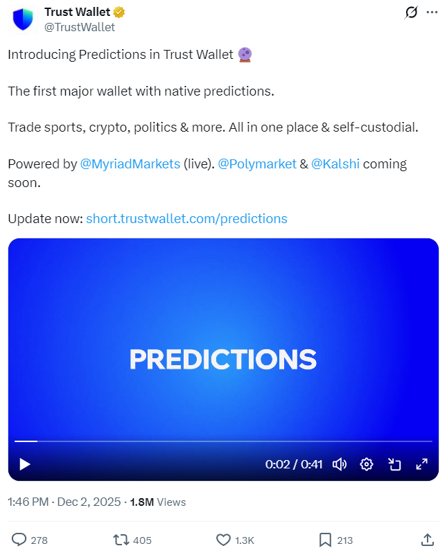 Пользователи в Predictions видят, как сообщество оценивает возможные итоги международных событий, криптоциклов, спортивных матчей и политических решений, а все действия выполняются внутри одного интерфейса. Компания планирует расширять перечень категорий, блокчейнов и провайдеров, чтобы усиливать роль Web3-кошелька как инструмента не только для хранения, но и для навигации по глобальным трендам в самостоятельной модели. Напоминаем, что недавно Trust Wallet стал криптобиржей и запустил платформу-акселератор Trust Moon, а также более года имеет интеграцию с украинской стейбкоин-гривной.