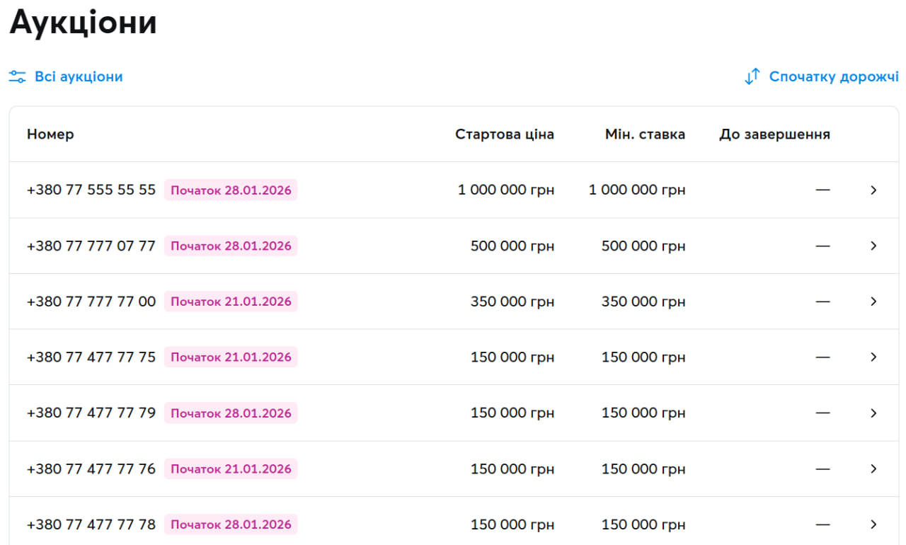 Это не единственный дорогой лот в серии. Уже 28 января стартует новый аукцион по номеру +380 77 555 55 55 55. Начальная цена также составляет ₴1 млн гривен. Следующие самые дорогие лоты стоят от ₴500 000 до ₴150 000 и ниже.