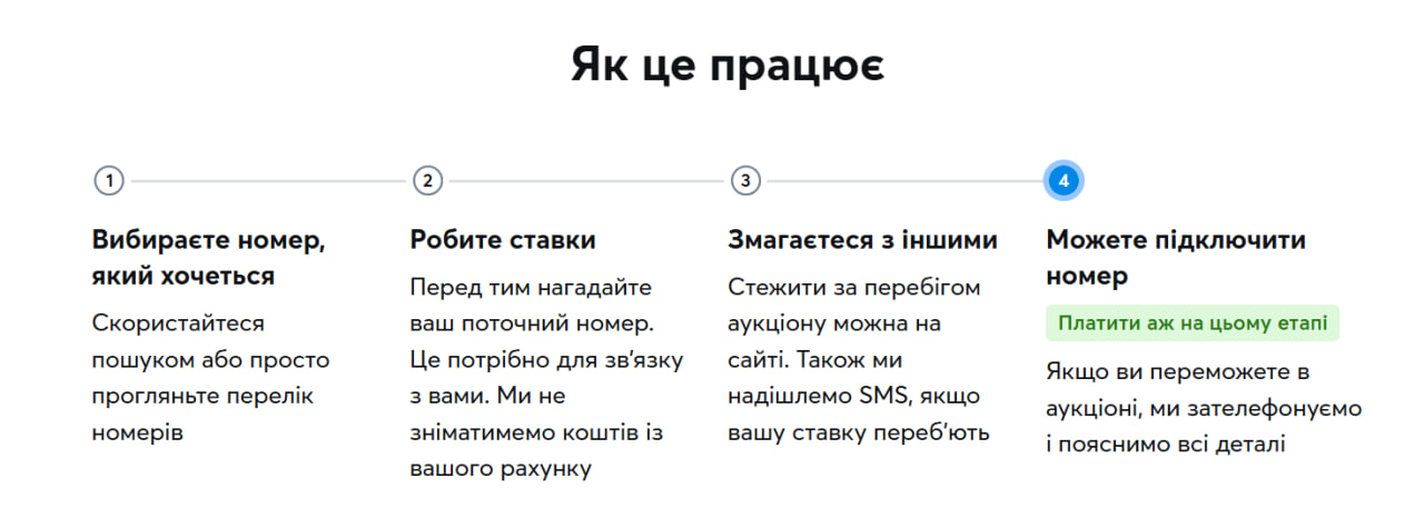 Отметим, что «Киевстар» получил новый код сети 077 в начале 2024 года. Оператор добавил его к старым кодам 067, 068, 096, 097 и 098. Уже осенью 2025 года компания запустила полноценные аукционы «хороших» номеров. Как пишет сама компания, такие номера часто покупают для бизнеса, брендов или публичных проектов, потому что их легче запомнить и они выглядят статусными.