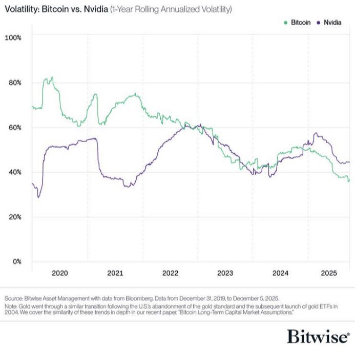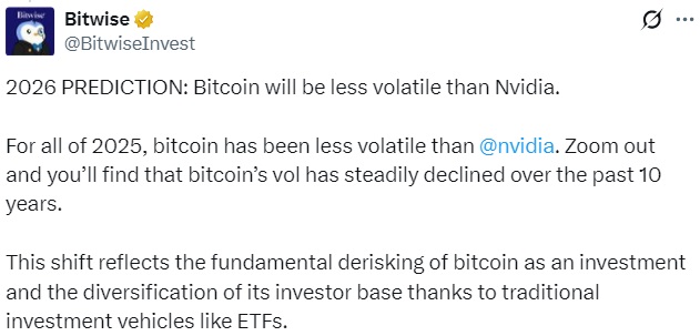По итогам 2025 года от Bitwise, колебания курса биткоина были слабее, чем у одного из ключевых технологических бенефициаров ИИ-бума — NVIDIA. Волатильность BTC снижается уже около десяти лет подряд. Это связывают не с исчезновением рисков, а с постепенным изменением структуры спроса: доля институциональных инвесторов растет, а доступ к активу расширился через биржевые фонды и другие классические финансовые инструменты. Ожидания на 2026 год остаются сдержанно оптимистичными — аналитики Bitwise считают, что биткоин и в дальнейшем будет вести себя более стабильно, чем в предыдущие циклы.