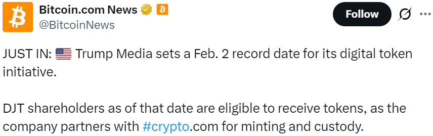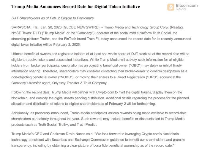 Компания Дональда Трампа объявила, что 2 февраля 2026 года станет датой фиксации права участия в выпуске нового цифрового токена, который она планирует раздать своим акционерам. Право на получение токенов будут иметь только владельцы как минимум одной полной акции DJT.