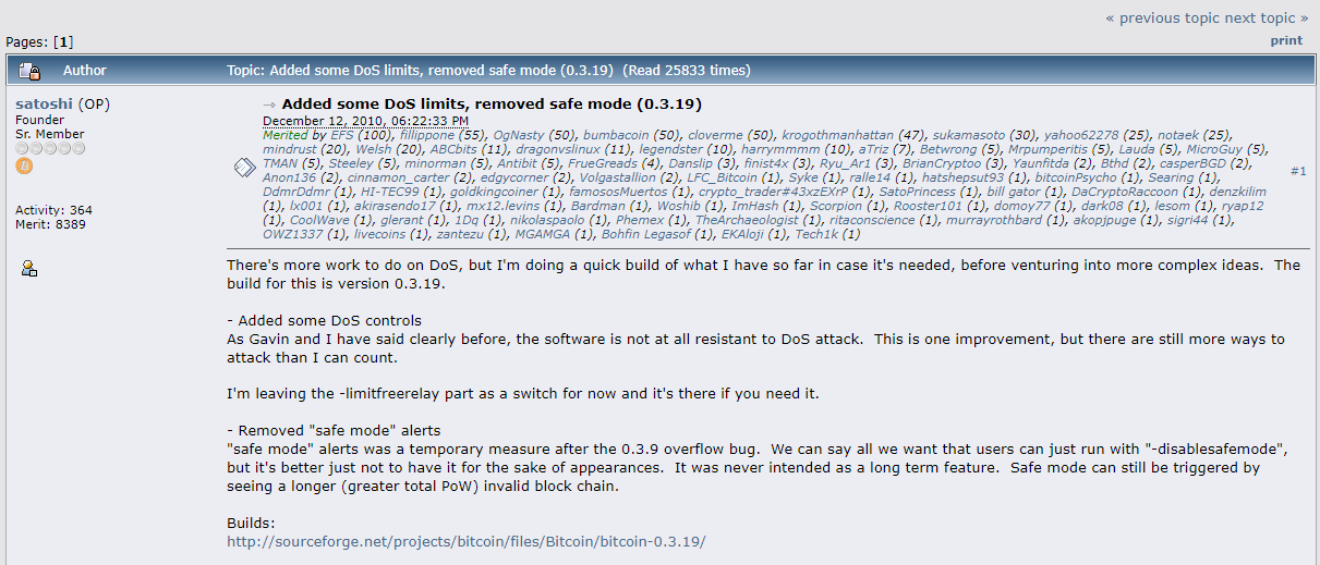 Сатоши Накамото опубликовал свое последнее публичное сообщение 12 декабря 2010 года и после этого исчез без объяснений. В апреле 2011 года с электронного адреса, связанного с ним, разработчику Майку Герну пришло письмо со словами «я перешел к другим делам». Ключевым событием перед этим стала публикация 1 ноября 2008 года документа Bitcoin: A Peer-to-Peer Electronic Cash System, в котором было предложено решение проблемы двойного расходования через публичный блокчейн. 3 января 2009 года Накамото сгенерировал генезис-блок и получил первые 50 BTC.