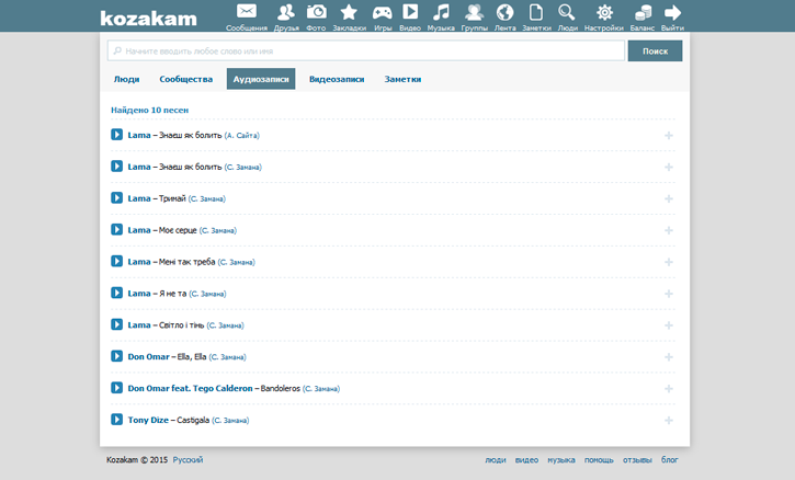 Соцсеть kozakam.com предоставляет все основные функциональные возможности, характерные для данного рода проектов. На данный момент количество зарегистрированных пользователей можно пересчитать на пальцах двух рук; есть возможность загружать в формате .mp3 пиратские композиции, а видео подтягивается с сервисов YouTube, RuTube, Vimeo.Com, Smotri.Com.