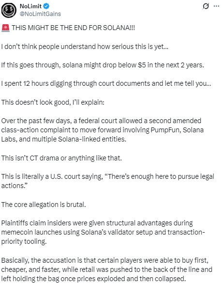 Пользователи X активно обсуждают сценарий, при котором цена Solana может упасть до $5. Причиной стал резонансный коллективный иск в США против платформы PumpFun, в котором также упоминаются Solana Labs и Solana Foundation. «The End for Solana» — так озвучивает ситуацию криптоблогер NoLimitGains.