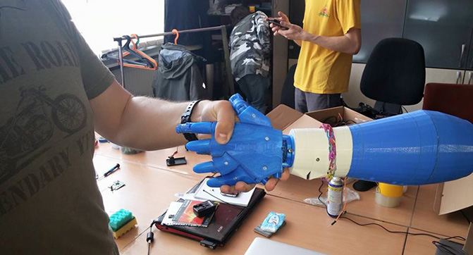 Сразу несколько команд в Украине сейчас занимается довольно амбициозным проектом: работают над протезом руки, напечатанном на 3D-принтере. При этом речь идёт не о механическом протезе, а таким, которым человек сможет управлять движениями мышц. Разработка ведется в Киеве и Львове. Киевская команда работает над прототипом в робототехнической лаборатории академии ШАГ.