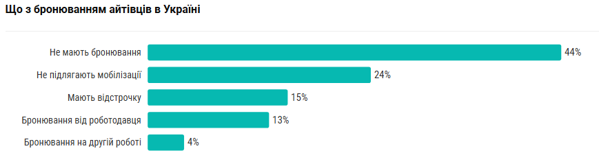 Между тем данные летнего исследования DOU, профильного сайта для IT-сообщества, показали, что около 44% опрошенных айтишников не имели бронирования. 13% из тех, кто находится в Украине, имели бронь от основного работодателя и еще 4% — на второй и неосновной работе.