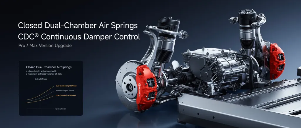 Инженеры также модернизировали подвеску. Версия Pro теперь имеет пневмоподвеску с CDC, которая ранее была только у Max. Все версии получили более широкие шины (245 мм спереди, 265 мм сзади) и 4-поршневые тормоза. Max дополнительно оснащается решениями Brembo.